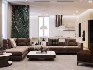В квартире просторная кухня-гостиная для веселого проведения времени в большой компании друзей или родственников площадью 55м2. Пять огромных окон по периметру комнаты придают ощущение дополнительного пространства и обьему гостиной.